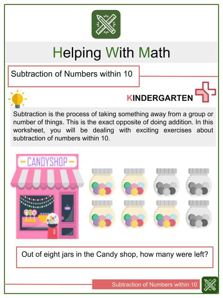 Here you will find our selection of free subtraction to 10 worksheets, subtraction facts, kindergarten math worksheets & homeschool math sheets for kids by . There you go, hope that . B.8 mentally adding & subtracting 10 & 100. Practice math problems like subtract 1 from a number. This educational activity provides word problems with manipulatives for kids to practice adding and subtracting within 10.